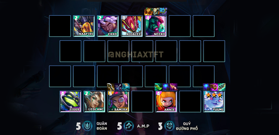 - Hàng trước: Neeko làm tanker chính, đứng ở vị trí chủ đạo chịu sát thương.